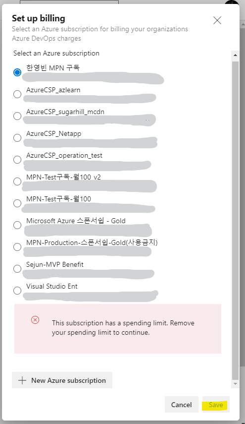 연결할 구독을 선택하고 연결합니다. 참고로 지출 제한 없는 구독만 연결이 가능하니, 지출제한 설정이 없는 구독을 선택 하시거나 지출 제한을 제거해야 연동이 가능합니다.