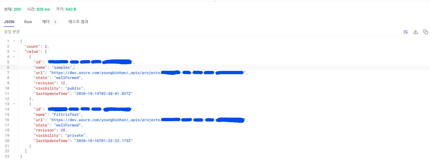 입력 후, 보내기 버튼을 클릭하여 API 를 호출하면 아래와 같이 JSON 형식으로 된 Azure DevOps 조직의 프로젝트 목록 데이터가 조회되는 것을 확인하실 수 있습니다.