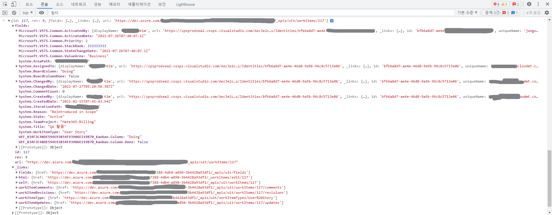실행 해 보면, API 호출에 대한 응답 데이터가 콘솔에 바로 나타나서 확인할 수 있는데요. Work Item 하나에 대한 자세한 데이터를 조회해서 보여주는 것을 확인할 수 있습니다.