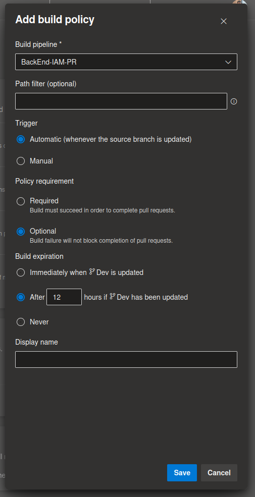 Build Validation 옆에 추가 버튼을 누르면 아래와 같은 화면이 나오는데, 앞서 새로 등록한 코드 리뷰 파이프라인을 선택하고 나머지 설정을 하면 된다. Trigger 는 Automatic 으로 해서 PR 제출 시 자동으로 실행 되도록 설정하고, Policy requirement 의 경우 실행 결과 성공/실패 여부로 PR 승인 여부를 정하는 것인데, 나의 경우는 AI 코드리뷰는 참고 용도여서 Optional 로 설정 하였다.