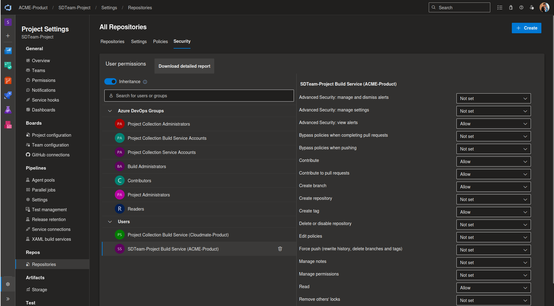 또한 이 파이프라인의 경우, Pull Request 에 댓글을 추가하는 작업이 있고, 해당 작업을 Azure Pipeline 빌드 서비스 이름으로 하는 것이여서 해당 Service Account (보통 <프로젝트명> Build Service (<조직명>)) 에 Contribute to pull requests 권한을 허용 해 주어야 코드리뷰 파이프라인이 정상적으로 작동할 수 있다.