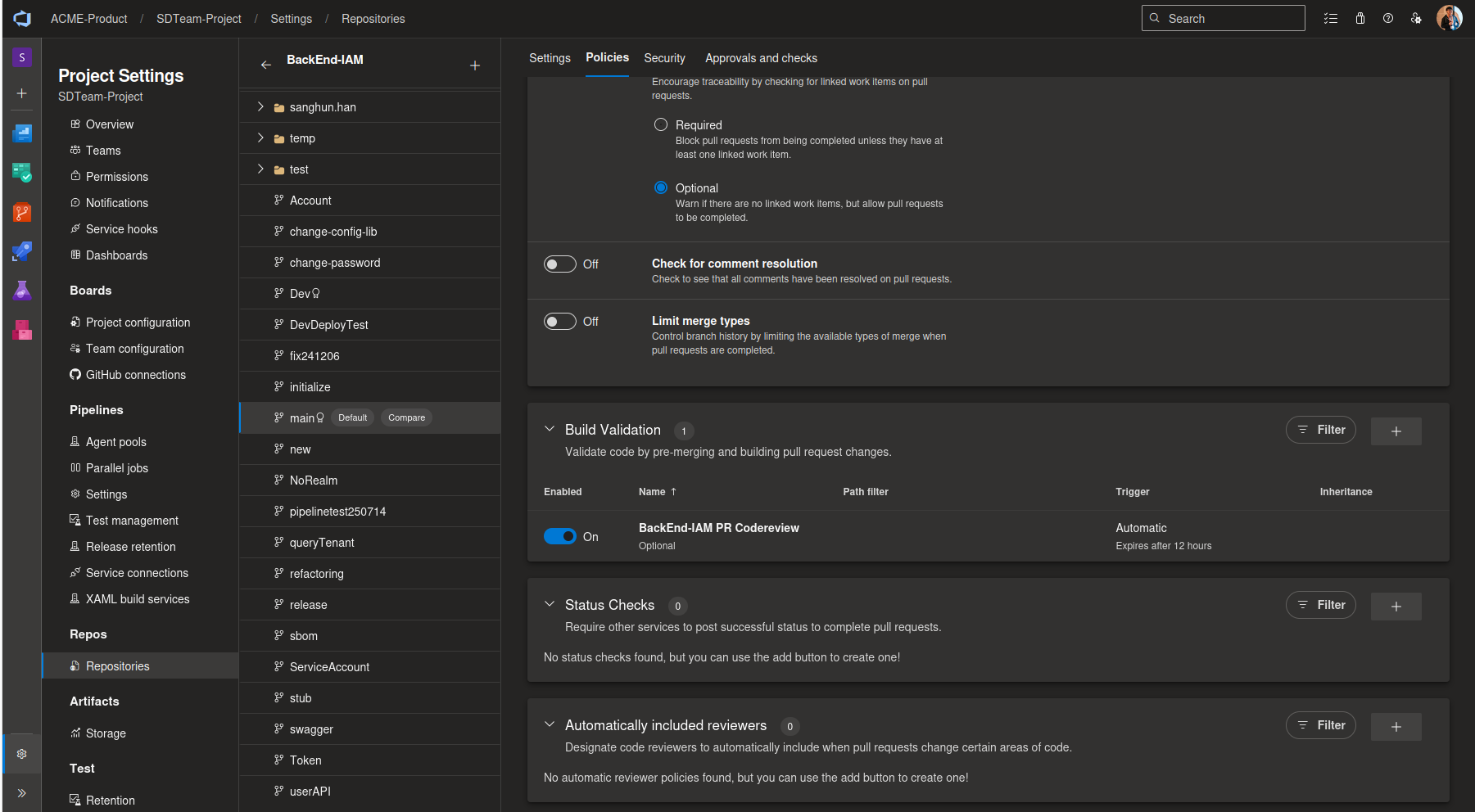그 다음 Pull Request 제출 시 트리거는 별도로 다른 설정이 필요한데, PR 병합 대상 브랜치에 대해서 Build Validation을 설정하는 것이다. Build Validation 설정은 Azure DevOps 의 Project settings → Repositories → 설정 대상 Repo → 대상 브랜치 선택 → Policies 탭에서 찾을 수 있다.