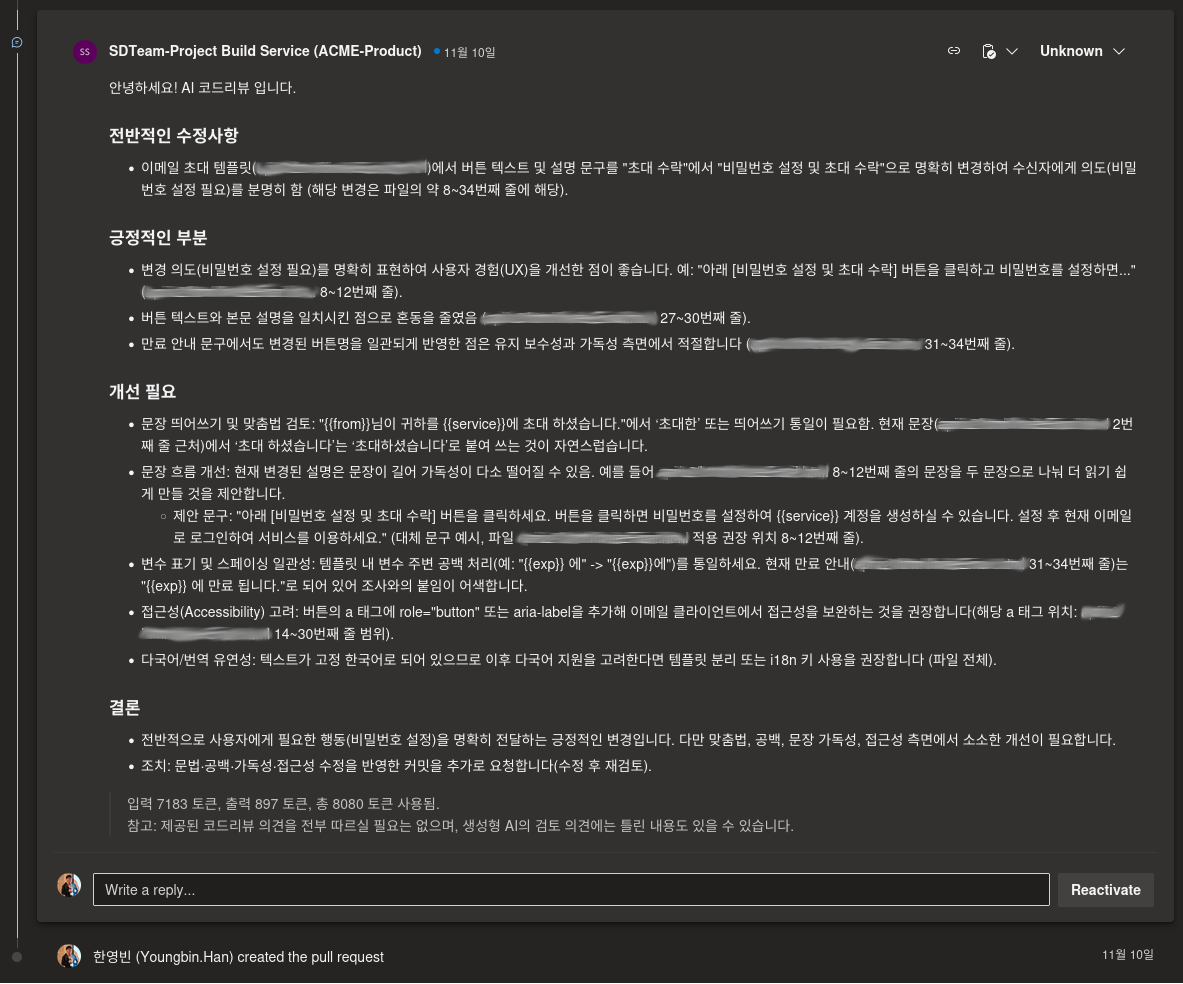 이런 솔루션은 사실 많이 있긴 한 것 같다. GitHub Copilot 에서 제공하는 코드리뷰 기능이라던가, CodeRabbit 등이 있겠다. 다만 이런 솔루션은 GitHub 에서만 이용 가능 하거나, 사내에서 쓰는 Azure DevOps를 지원 한다 하여도 별도로 결재는 해야 하다 보니, 그냥 간단히 파이프라인 하나 만들자는 생각을 하고 진행하여 내가 주로 유지보수 하는 몇몇 프로젝트에 붙여보게 되었다.