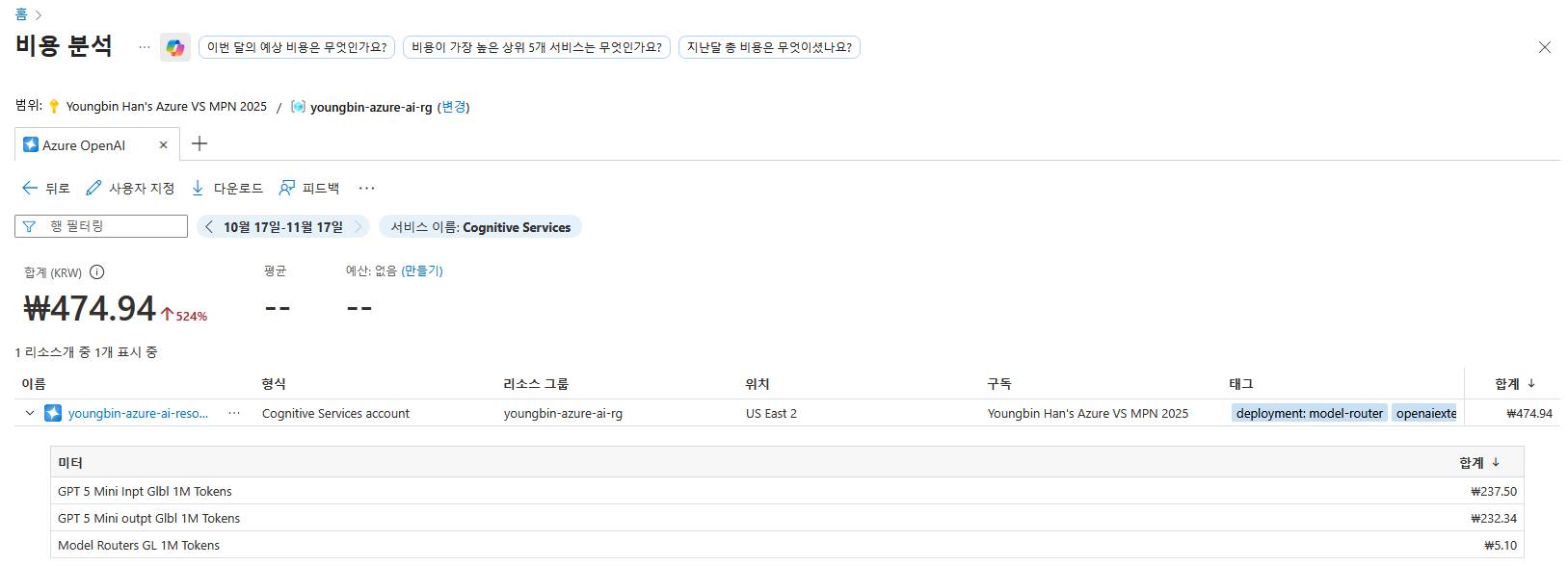 회사에서 이렇게 만들어 붙인 AI 코드리뷰를 사용한지 한달 넘었다. 사용 토큰 수는 대략 95-96만 토큰, 비용은 475원(?) 정도 나오는 것 같다. 아무래도 model-router 에서 대부분의 코드리뷰 요청 프롬프트를 GPT-5-Mini 로 보내서 그런것이 아닌가 싶기도 하다.
